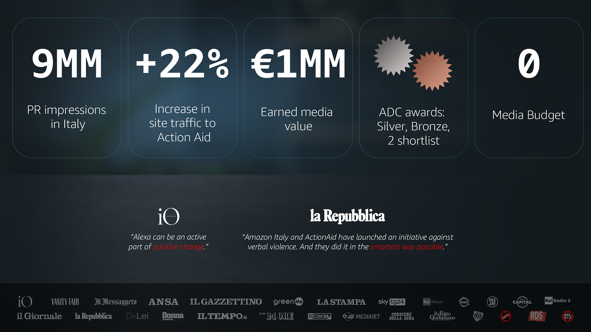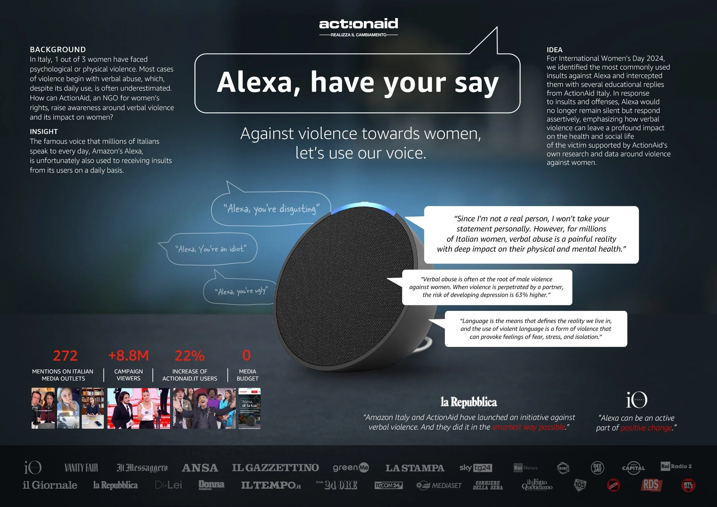 “Alexa, dì la tua”, I led the creative transformation of what started as a standard International Women’s Day announcement into a powerful message with real impact. When we turned Alexa into an unexpected advocate against verbal abuse, the campaign earned serious industry recognition, landing on the shortlist for both ADC Europe’s Interactive & Mobile and ADCI’s Branded Content/Entertainment awards actionaid.it+2actionaid.it+2recnews.it+2. This wasn’t just amplification,
